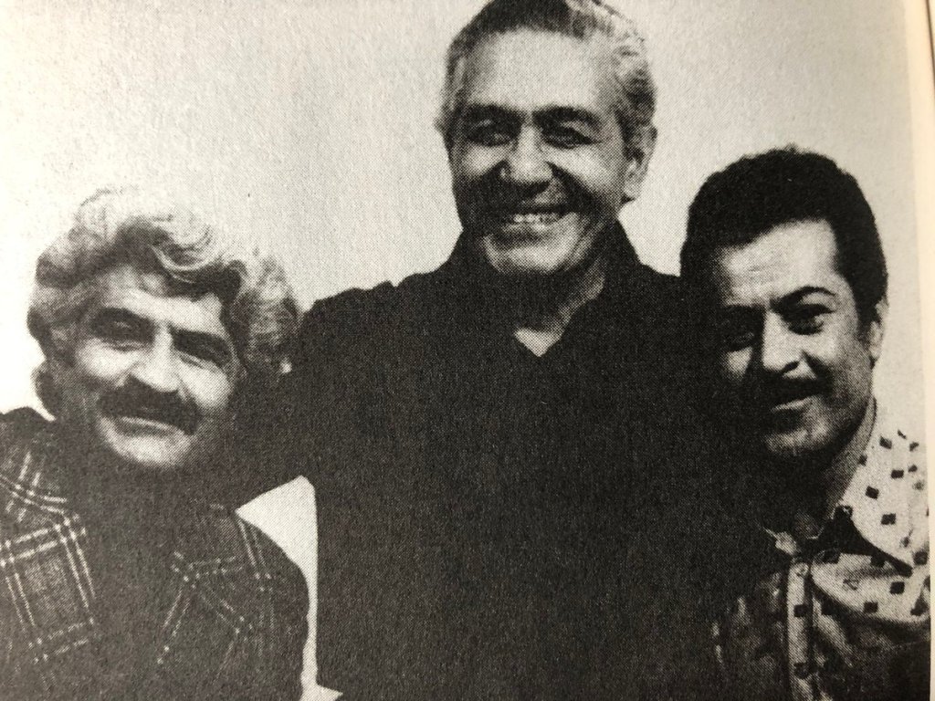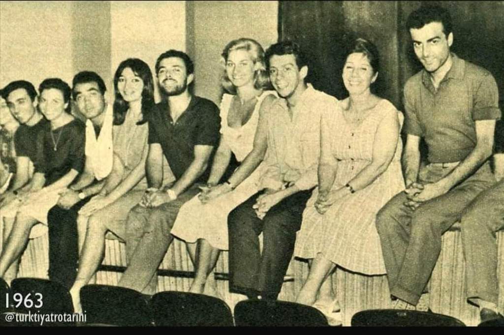 Dostlar Tiyatrosu’nun ilk oyunu olan Ha-Me-Ka-Ha-Ha-Pe’den bir fotoğraf. (Haysiyetli Milli Kalkınma ve Hak Hukuk Partisi) 15 Ekim 1969- Şevket Altuğ, Genco Erkal, Arif Erkin, Halit Akçatepe ,Mehmet Akan, Bilge Şen